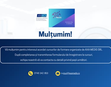 Partenerii noștri, Axa Medis, vă pun la dispoziție o serie de cursuri specializate, dedicate creșterii calității serviciilor medicale: