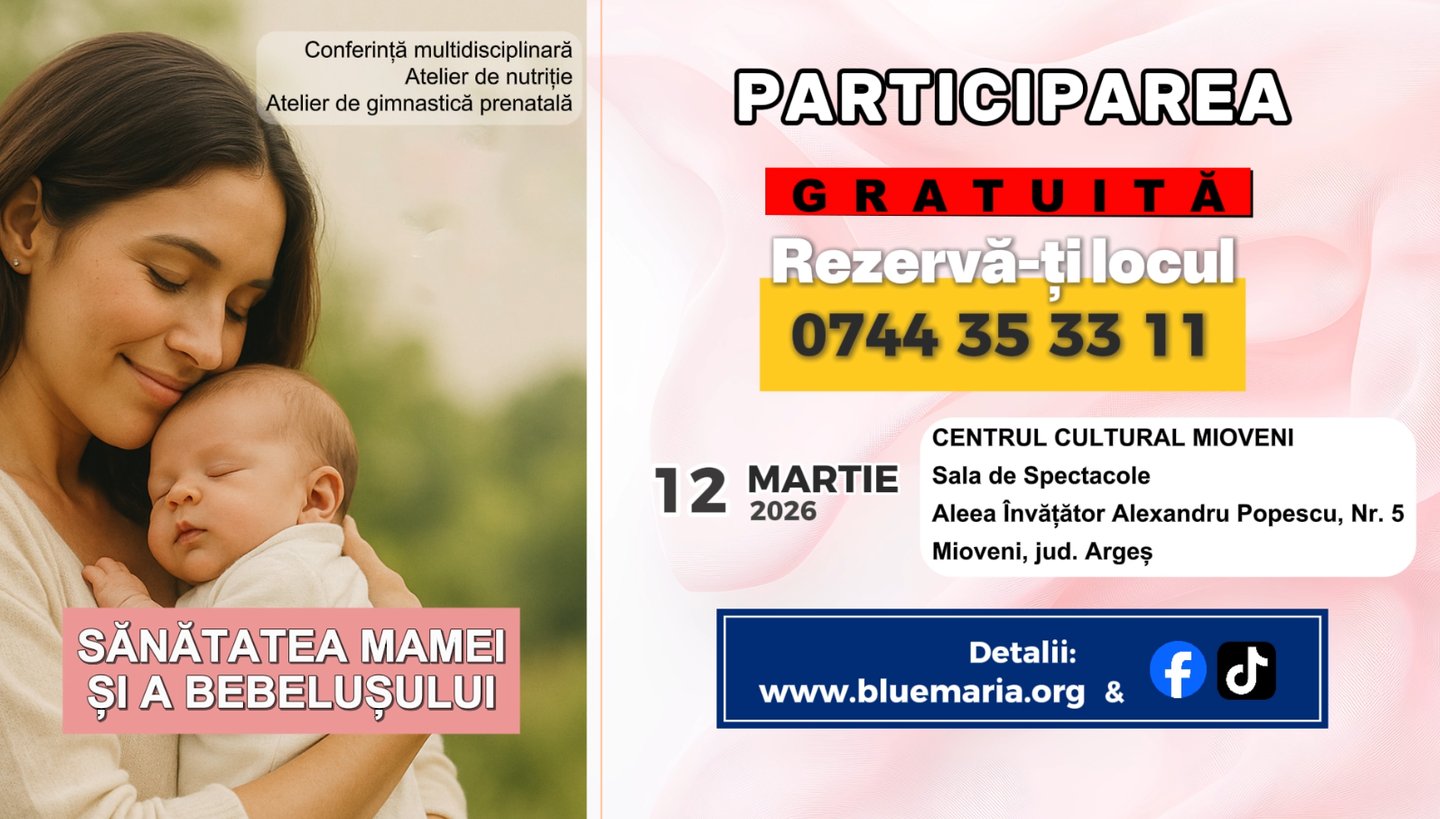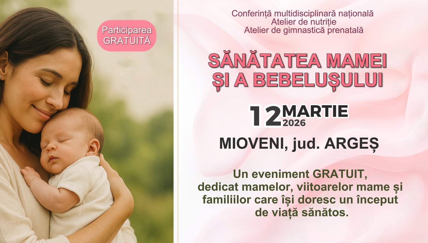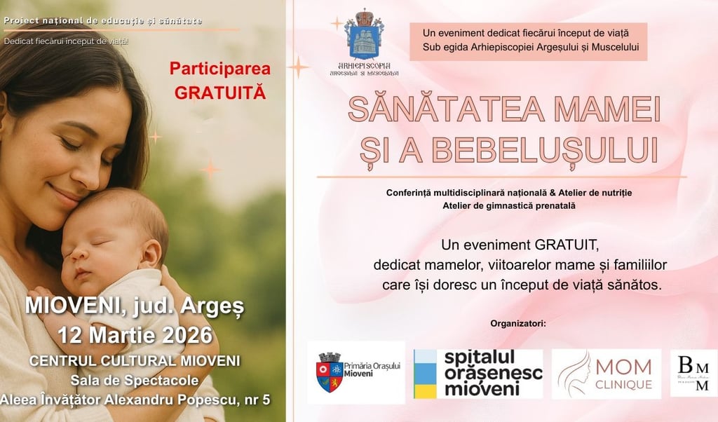 Pe 12 martie 2026, de la ora 10:00, la Centrul Cultural Mioveni – Sala de spectacole, are loc ediția locală a conferinței „Sănătatea Mamei și a Bebelușului”, un eveniment național de educație pentru sănătate perinatală, construit ca o întâlnire completă între comunitate și specialiști.